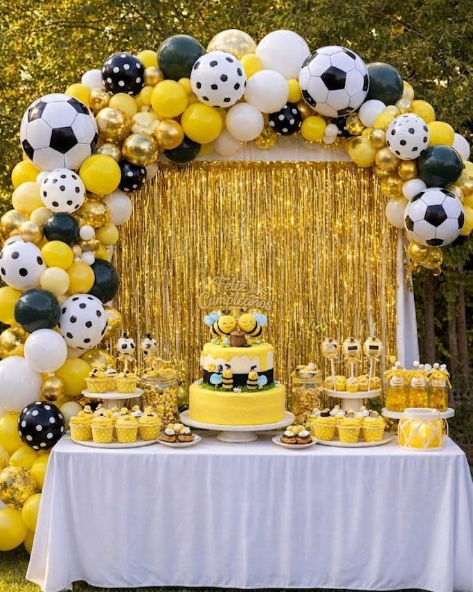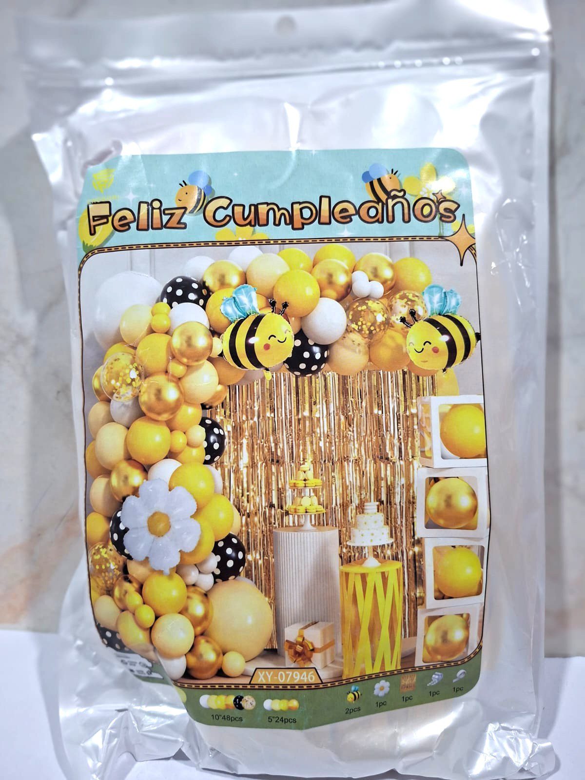 Set de decoración formado por una cortina de lluvia metalizada, cinta para arco orgánica , globos de látex y figuras abeja y margaritas , total 80 piezas