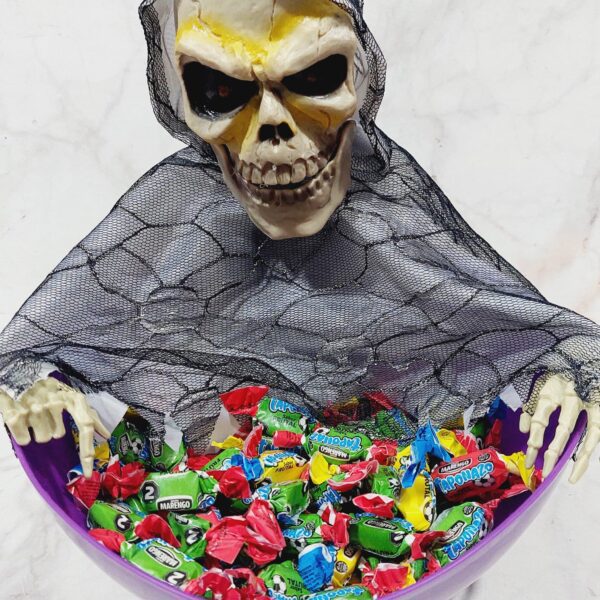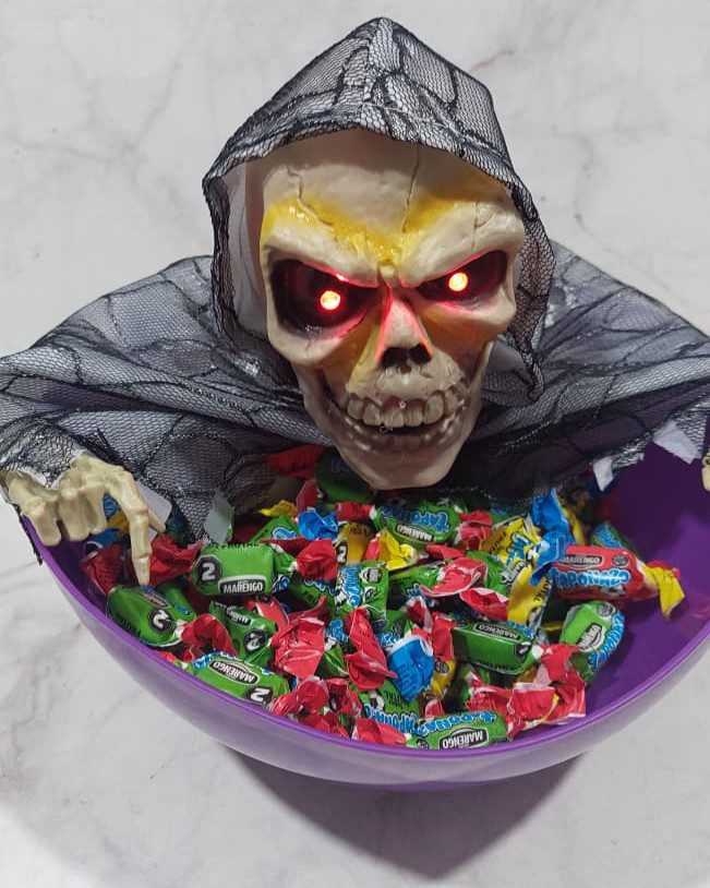 Caramelera calavera con luz , sonido y movimiento. Usa 3 pilas 2A no incluídas .Diámetro aprox 27 cm .