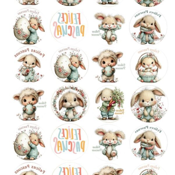Lámina chocotransfers motivo de Pascuas conejitos, la cantidad por lamina depende de la medida de cada imagen. Esta lámina contiene 12 imagenes de 6 cm de alto