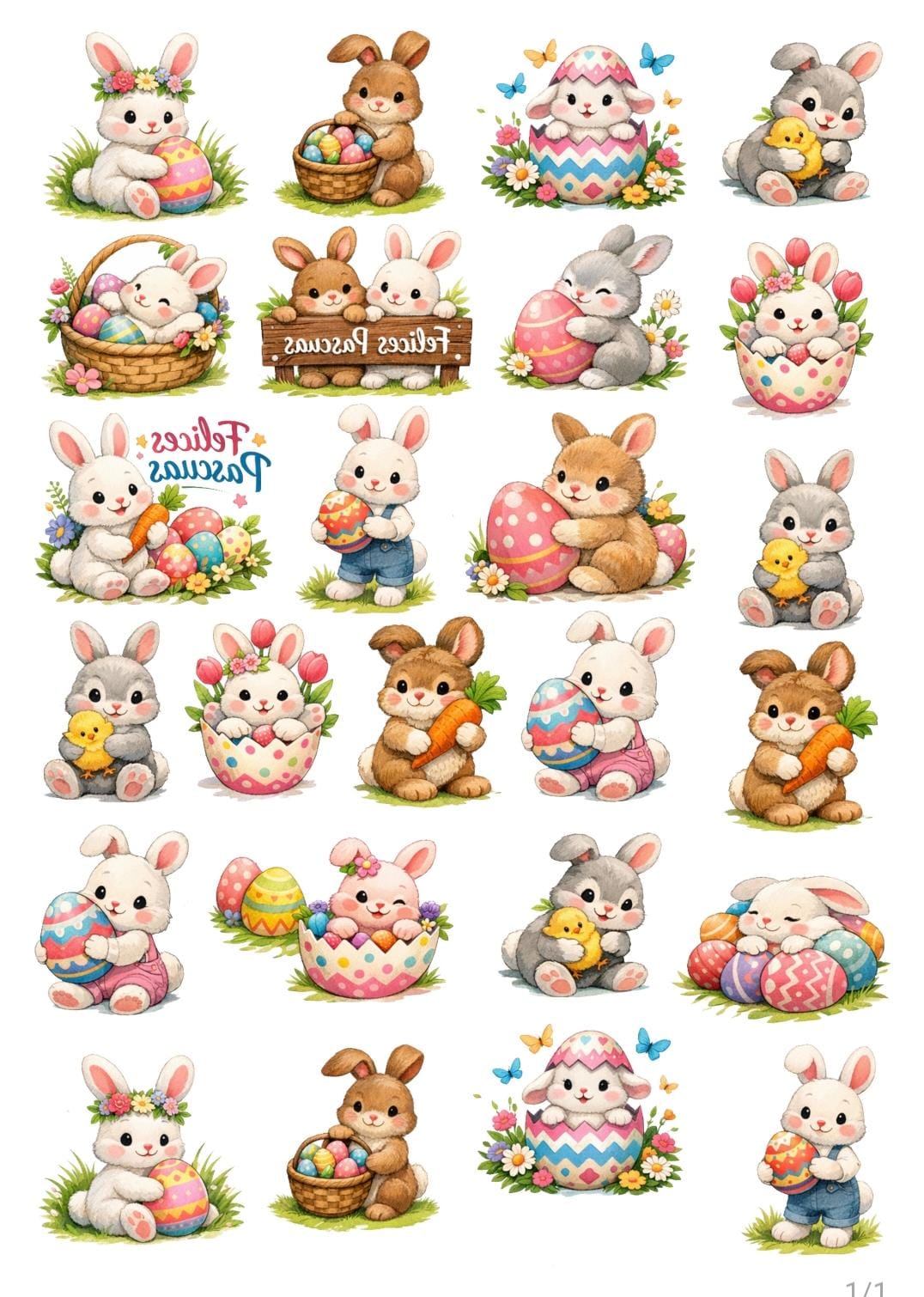 Lámina chocotransfers motivo de Pascuas conejitos, la cantidad por lamina depende de la medida de cada imagen. Esta lámina contiene 24 imagenes de 4 cm de alto